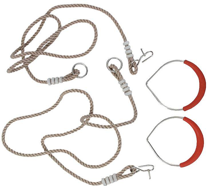 Kruhy závěsné (dětské). Výrobek je určený na zahrady domů a do školek pro rozvoj obratnosti a síly dětí. Nosnost 40 kg. Výrobek není vhodný pro děti do 3 let. Kruhy jsou k dispozici v provedení s bílými lany a úchytů dle fotografie.