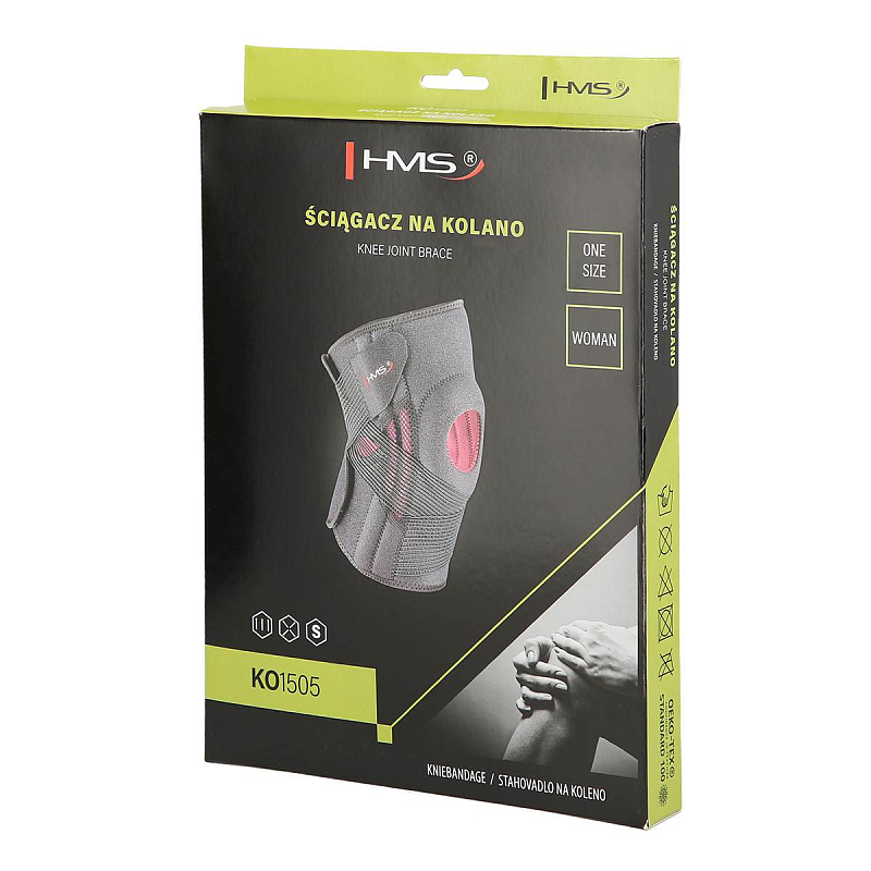 Bandáž na koleno HMS KO1505 najde uplatnění při muskuloskeletálních dysfunkcích v oblasti kolene, které vyžadují relativní imobilizaci. Zvyšuje stabilizaci kloubu, a proto může být užitečná i při bolestivých stavech. Výrobek je lehký, měkký a pohodlný a nezpůsobuje nepohodlí ani při celodenním nošení. Bandáž je vyrobena z vysoce kvalitních materiálů, které zaručují vysoký komfort používání. KO1505 má zapínání na suchý zip a přídavné gumičky pro stabilizaci kolenní čéšky. Její anatomická profilace se dokonale přizpůsobuje tvaru těla. Díky absenci dlah nebo výztuh lze bandáž používat při sportovních aktivitách.