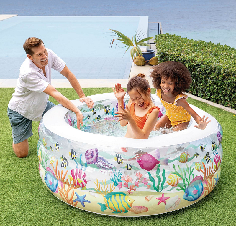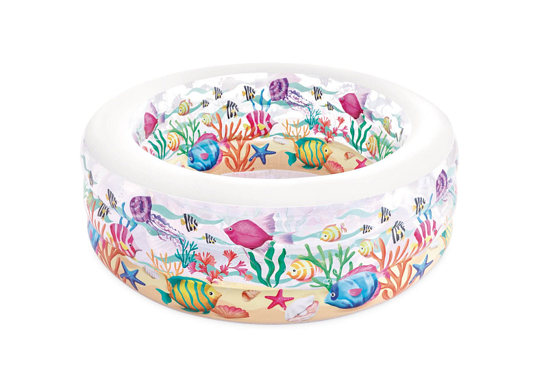 Je nafukovací bazén na zahradu i na podlahu, který udělá radost nejen vašim dětem. Bazén doporučujeme stavět na rovný povrch, díky tomu je dostatečně stabilní a pohodlný. Komfortní měkké dno je vyrobeno z vinylového materiálu 0,3 mm. Do bazénu jde napustit 318 l vody. Rozměr po napuštění bazénu 152 x 56 cm. Barevný motiv působí jako akvárium, je částečně průhledný. Vypouštění bazénu vám usnadní vypouštěcí ventil. Součástí balení je sada pro opravy.