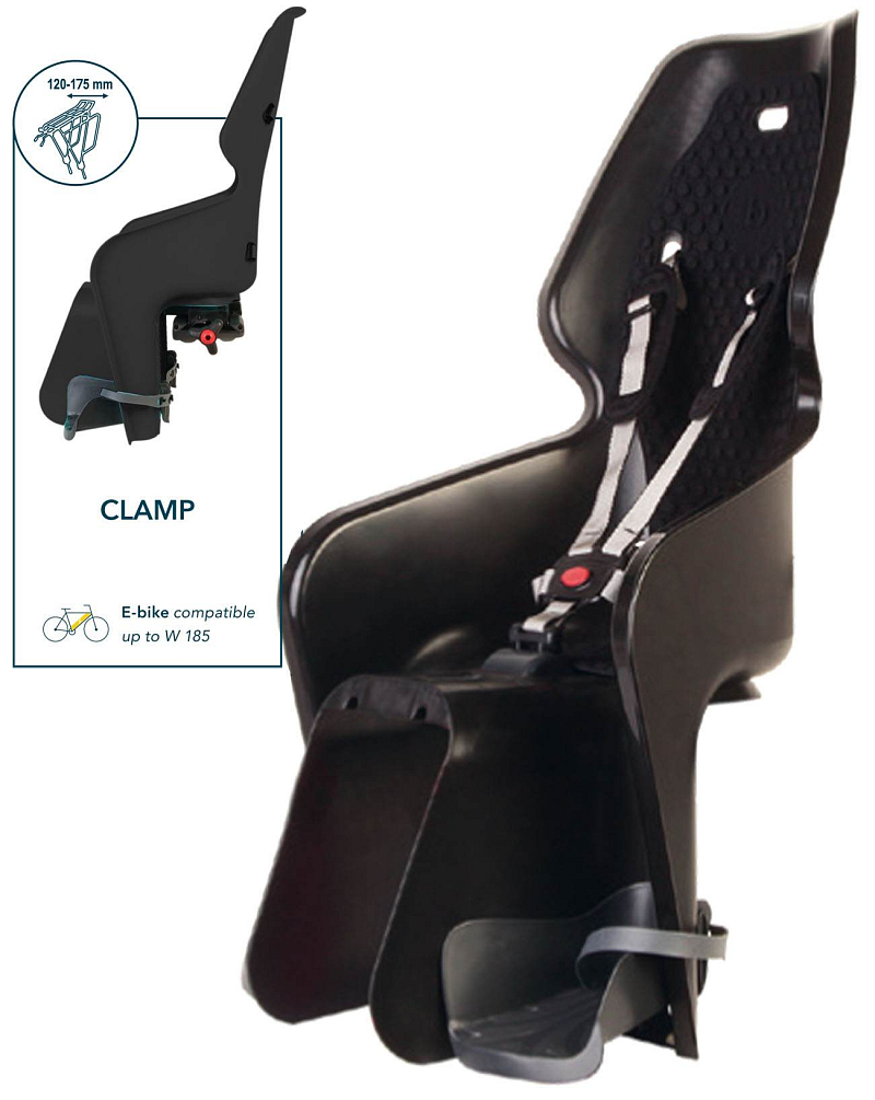 Špičková dětská sedačka na jízdní kolo s upínacím systémem CLAMP na nosič kola o šířce 120 – 175 mm je kvalitní model s velkými větracími otvory, vysokými bočnicemi na držení dětí. Plastový skelet ze zdravotně nezávadného materiálu vyplněný měkkou omyvatelnou vložkou pro pohodlné sezení. Pro zajištění bezpečnosti dětí je v sedačce 5 bodový bezpečnostní pás. Výškově stavitelné podložky pod nohy s pohodlnými upevňovacími přezkami na nohy s jednoduchým ovládáním, možnost nastavení 13 poloh dle výšky dítěte, široké bočnice chránící nohy dítěte před vložením do paprsků kol. Rozměry sedačky jsou : , hmotnost je 2,68 kg. Sedačka je v barvě černé.