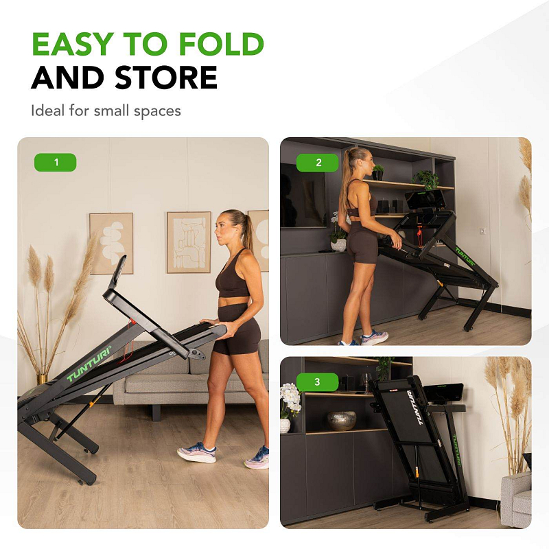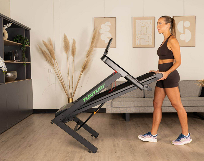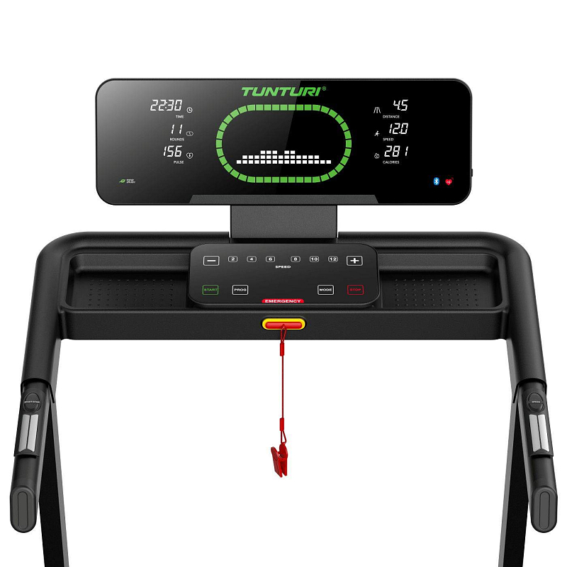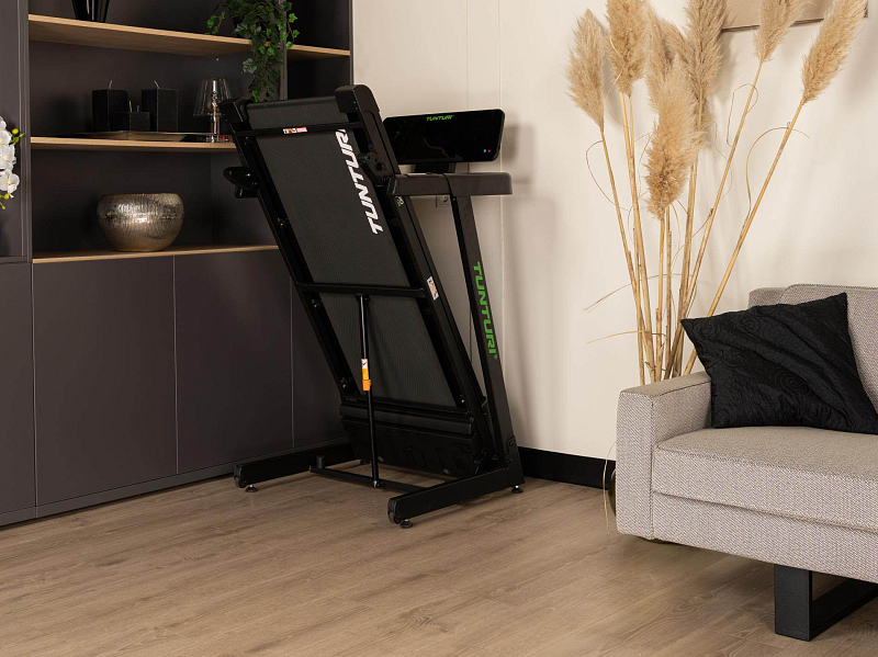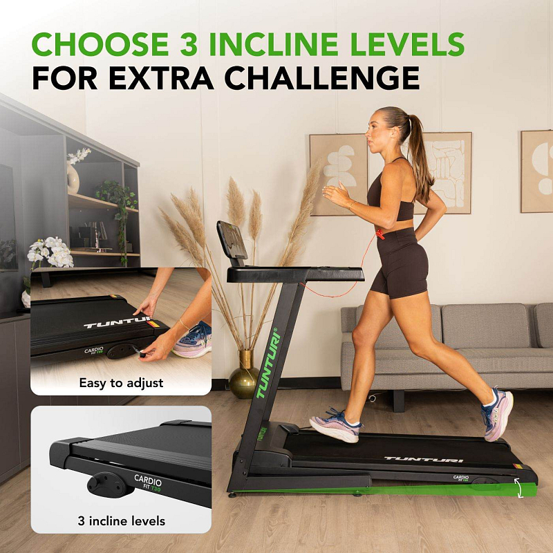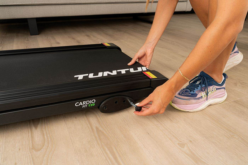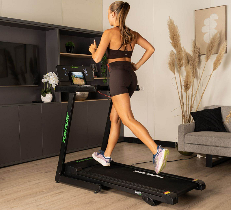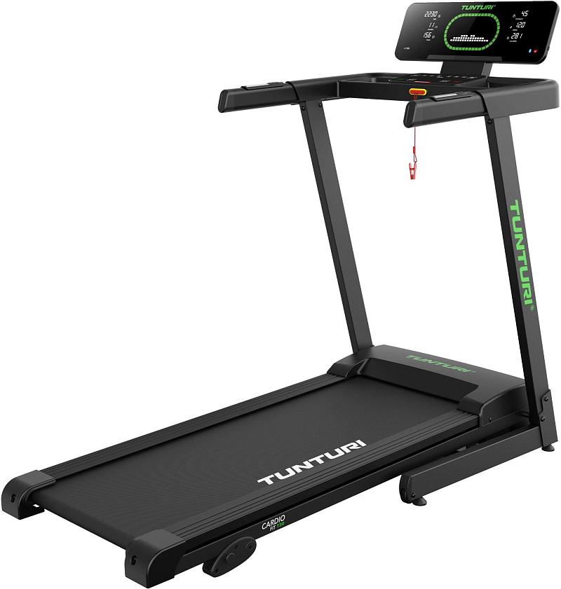 TUNTURI Cardio Fit T30 je kompaktní běžecký pás určený pro domácí využití, který nabízí běžeckou plochu 120 × 43 cm, rychlost až 14 km/h, 23 tréninkových programů, manuálně nastavitelný sklon a Bluetooth připojení pro aplikace i hrudní pás.