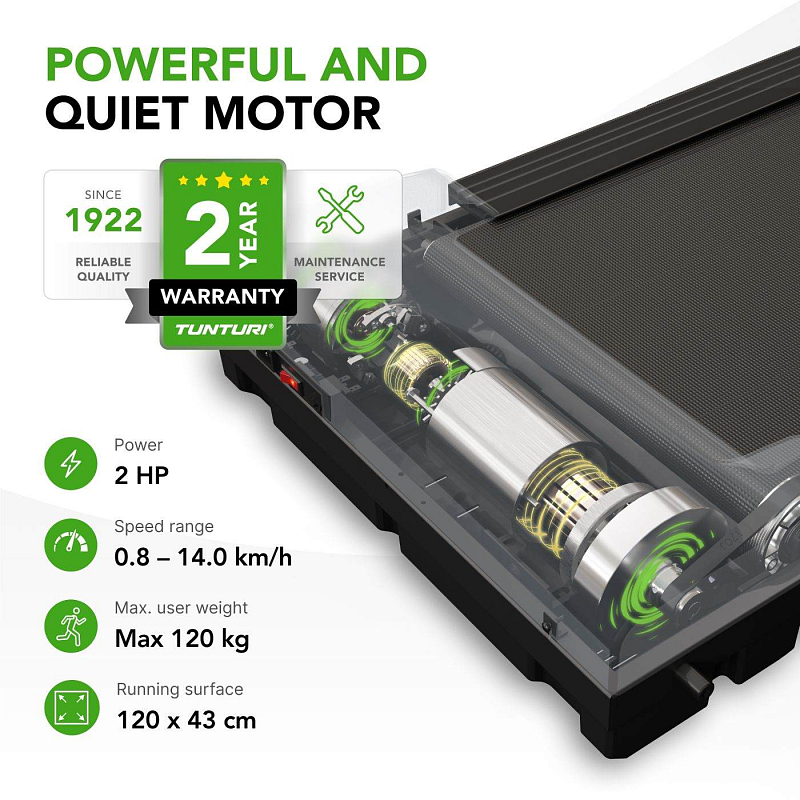 • Prostorná běžecká plocha 120 × 43 cm s nastavitelnou rychlostí až do 14 km/h
