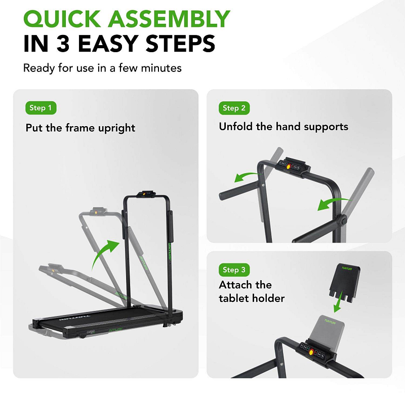 Pás se dodává zcela smontovaný a připravený k použití – rozložíte ho ve třech jednoduchých krocích a můžete hned začít trénovat. Nezabere přitom téměř žádné místo – ve složeném stavu měří pouhých 12,5 cm na výšku a snadno ho zasunete pod postel nebo gauč.