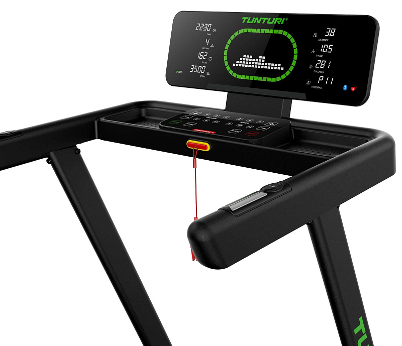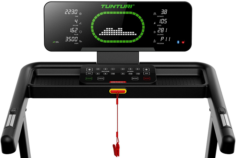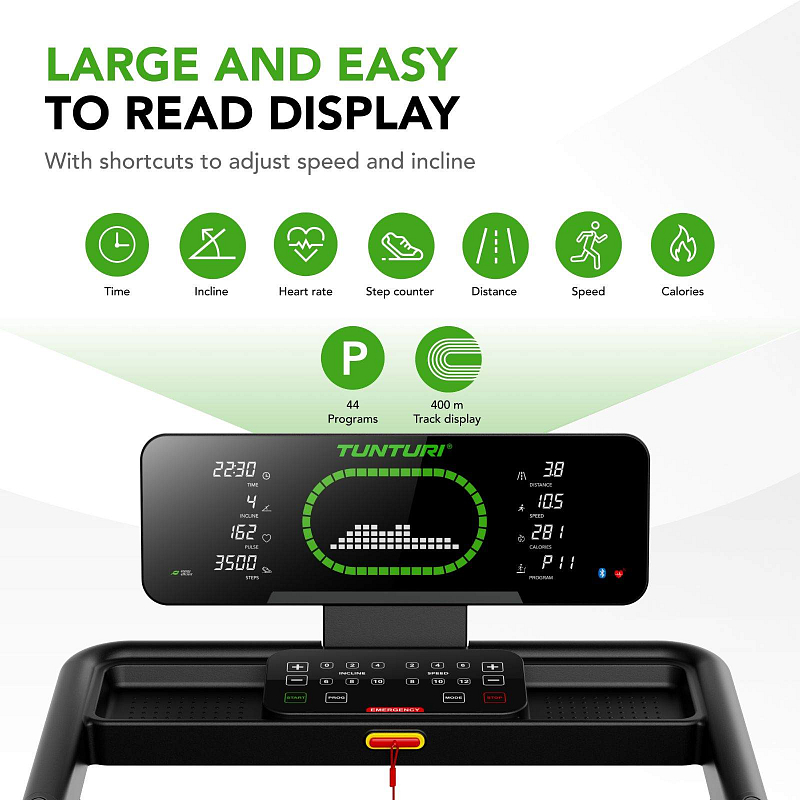 Pro maximální variabilitu tréninku je TUNTURI Cardio Fit T50 vybaven 44 tréninkovými programy, včetně HRC režimů řízených podle tepové frekvence, uživatelských programů, testu tělesného tuku i funkce rychlého startu. Na přehledném LED displeji s vizualizací atletického oválu vidíte všechna důležitá data přehledně uspořádaná po stranách – a i při použití tabletu zůstávají stále na očích. Nechybí držák na tablet, senzory tepu, rychlá tlačítka pro změnu rychlosti a sklonu a Bluetooth konektivita pro připojení k aplikacím i hrudnímu pásu.