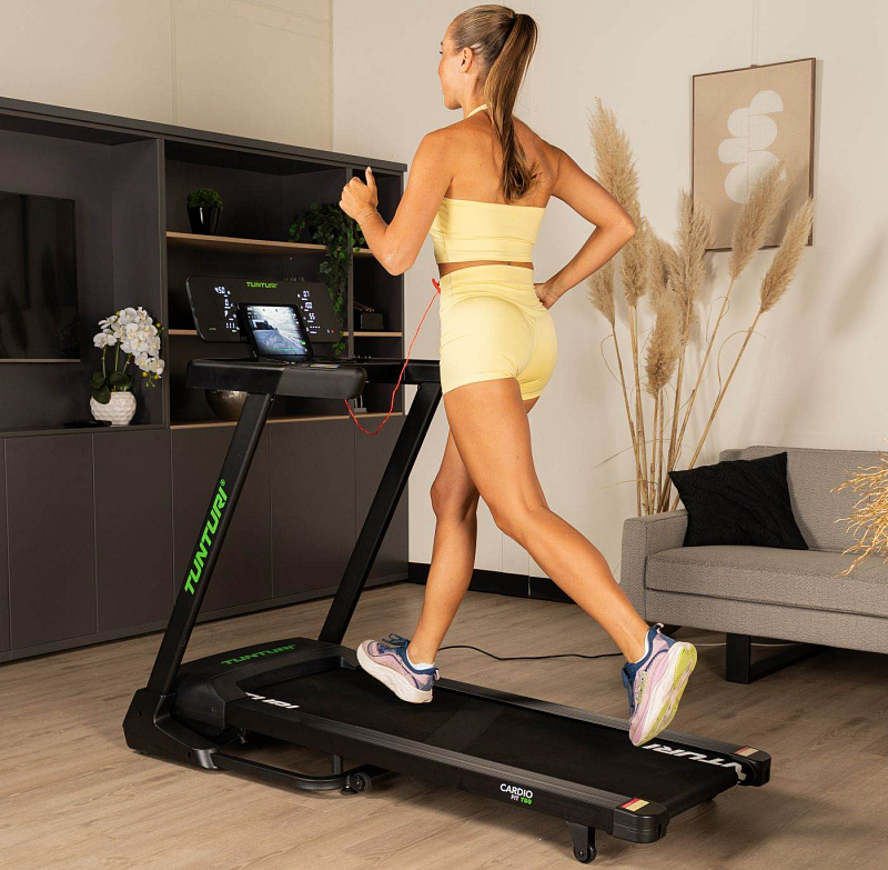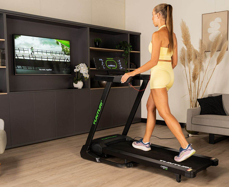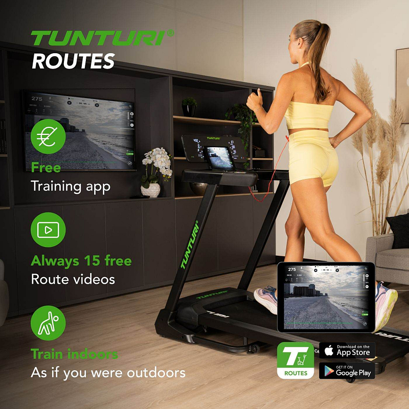 TUNTURI Cardio Fit T50 podporuje připojení k oblíbeným tréninkovým aplikacím – Tunturi Routes, Kinomap, MyHomeFIT a Zwift. Díky nim se běžná chůze nebo běh promění v interaktivní zážitek. Můžete se vydat na virtuální procházku podél pláží, ulicemi světových metropolí nebo přes horské stezky. Aplikace Tunturi Routes je zdarma ke stažení a poskytuje přístup k 15 videotréninkům, které se přizpůsobují vaší rychlosti. Prémiová verze pak nabízí stovky tras po celém světě.