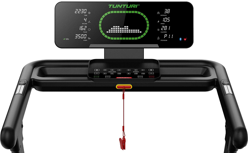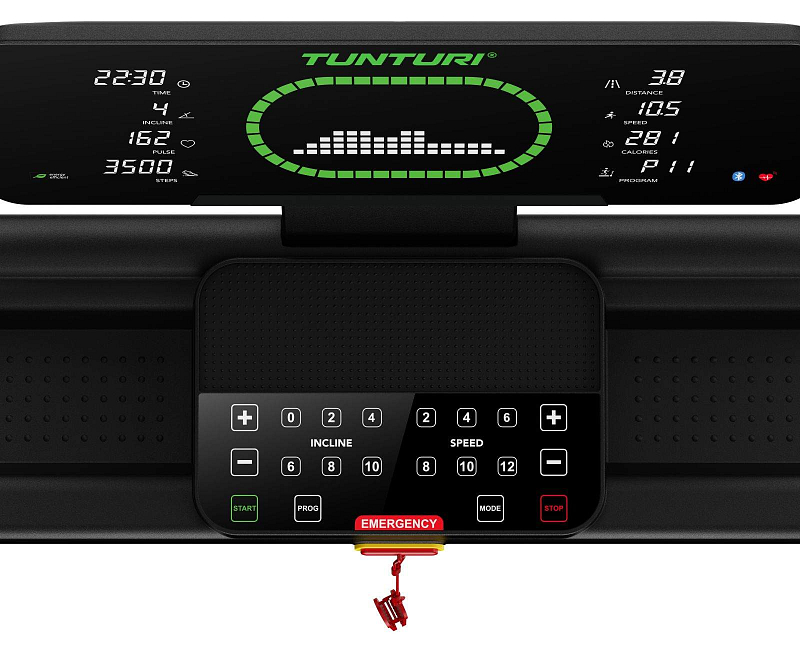| Měřené hodnoty: | Spálené kalorie, Tep srdce, Vzdálenost, Signalizace překročení tepu, Čas běhu, Rychlost běhu, Sklon pásu |