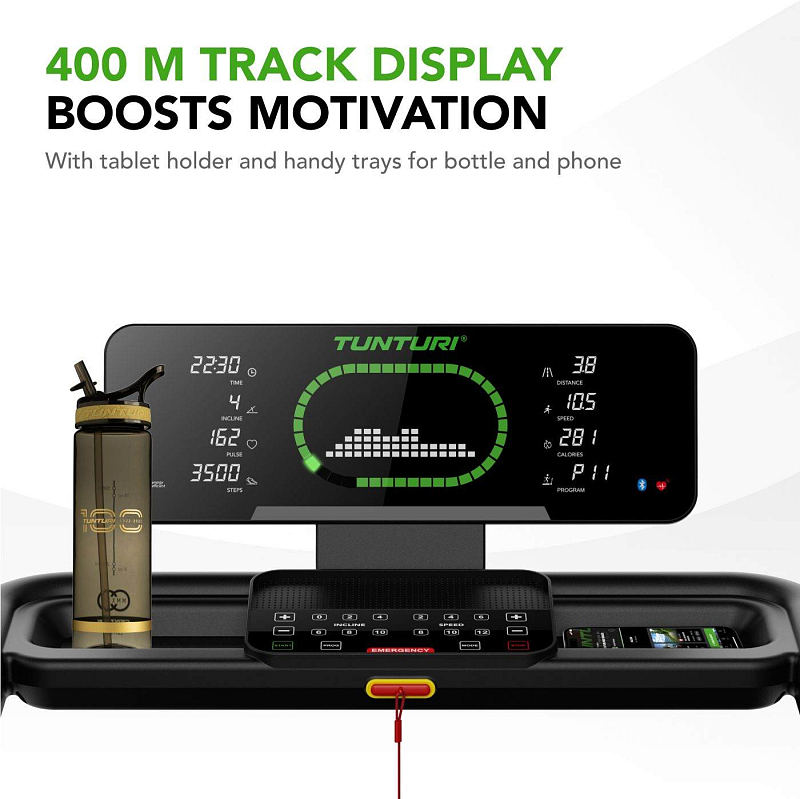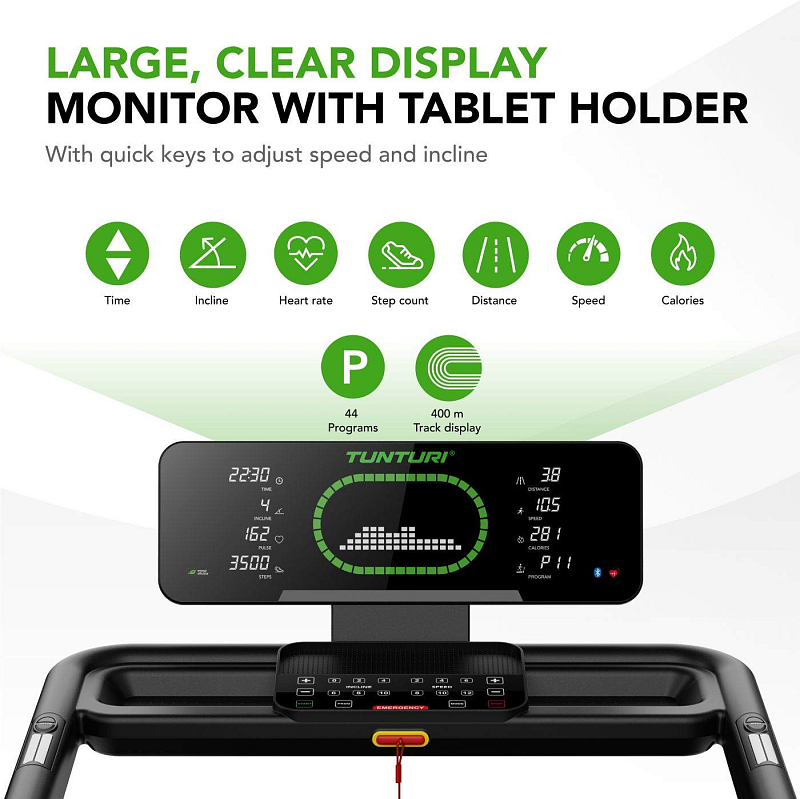 Výhodou je plně předinstalované provedení – po vybalení je pás připraven k použití během pár minut. Pro maximální variabilitu tréninku je TUNTURI Cardio Fit T60 vybaven 44 tréninkovými programy, včetně HRC režimů řízených podle tepové frekvence, uživatelských programů, testu tělesného tuku i funkce rychlého startu. Na přehledném LED displeji s vizualizací atletického oválu vidíte všechna důležitá data přehledně uspořádaná po stranách – a i při použití tabletu zůstávají stále na očích.