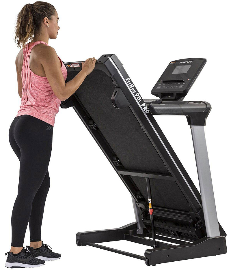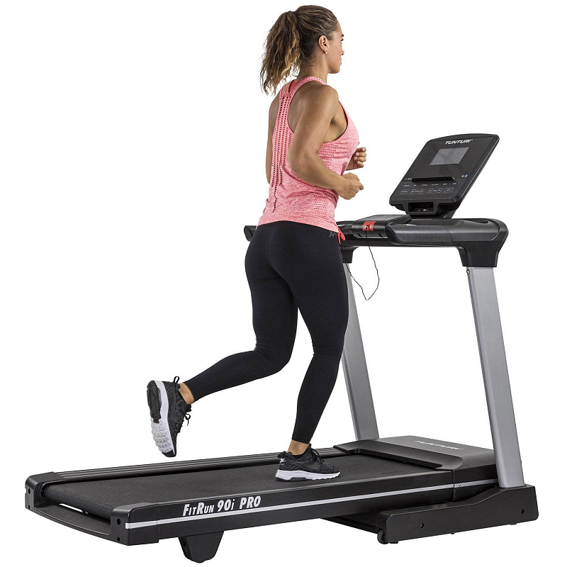 Součástí trenažéru Tunturi FitRun 90i je počítač s programy, USB portem pro napájení, Bluetooth zařízením pro připojení tréninkové aplikace Tunturi routes. Dále je vybaven transportními kolečky pro snadnou manipulaci a vyrovnávači nerovnosti pro maximální stabilitu. Běžecký pás je možné složit do vertikální polohy.