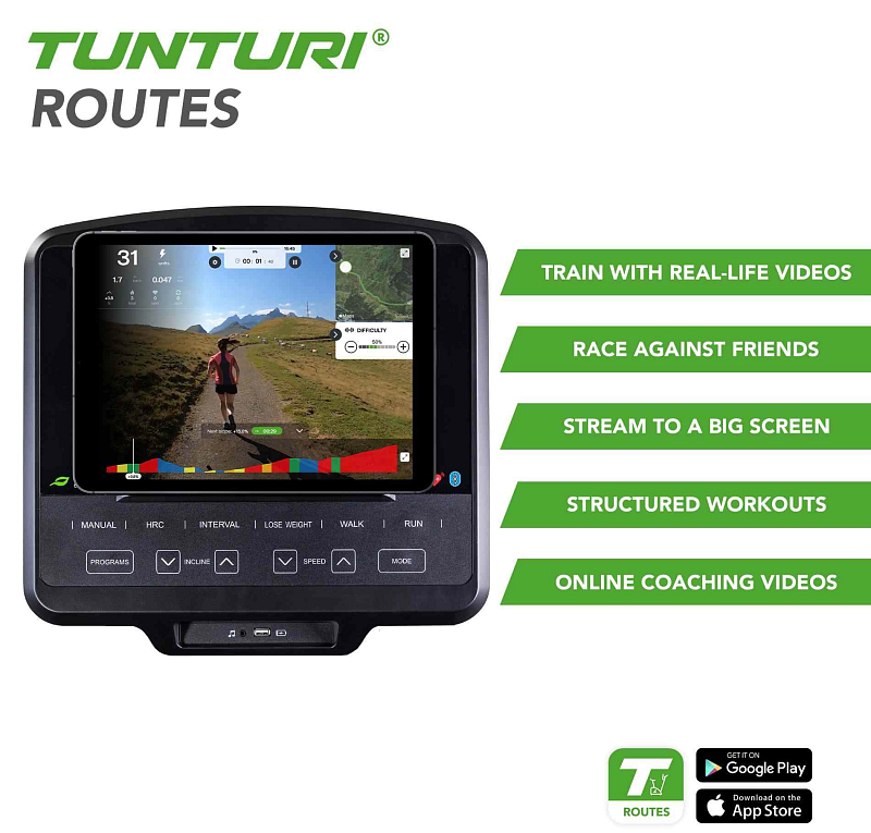 - Tréninková aplikace - díky připojení aplikace Tunturi routes. Tréninkové aplikace jsou produktem třetí strany a neneseme odpovědnost za jejich funkčnost. Pokud byste měli samozřejmě jakýkoliv dotaz, rádi vám poradíme.