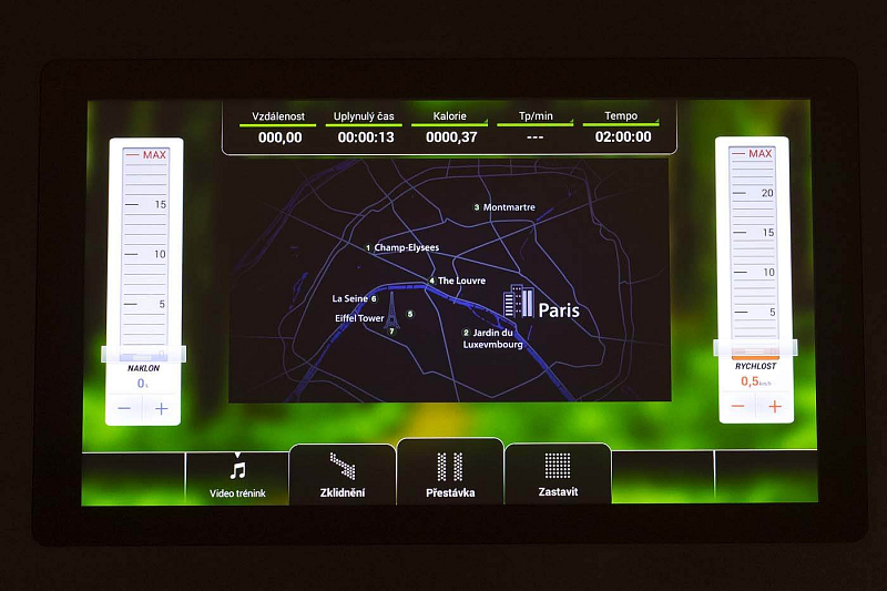 • Zobrazené hodnoty: čas, rychlost, vzdálenost, kalorie, watty, sklon, tepová frekvence