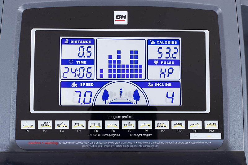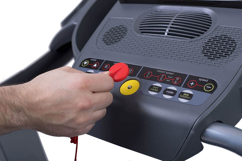 | Měřené hodnoty: | Spálené kalorie, Tep srdce, Vzdálenost, Signalizace překročení tepu, Čas běhu, Rychlost běhu, Sklon pásu |