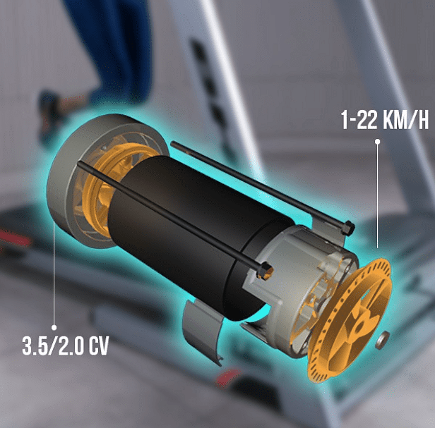 Trenažér s motorem o max. výkonu 4,0 HP umožňuje nastavení rychlostí v rozmezí 1 až 22 km/h. Běžecká plocha o rozměrech 50 x 140 cm je vybavena kvalitním odpružením, které zaručí měkký došlap a zmírní otřesy na minimum. Sklon je elektronicky regulovatelný až do 12 %.
