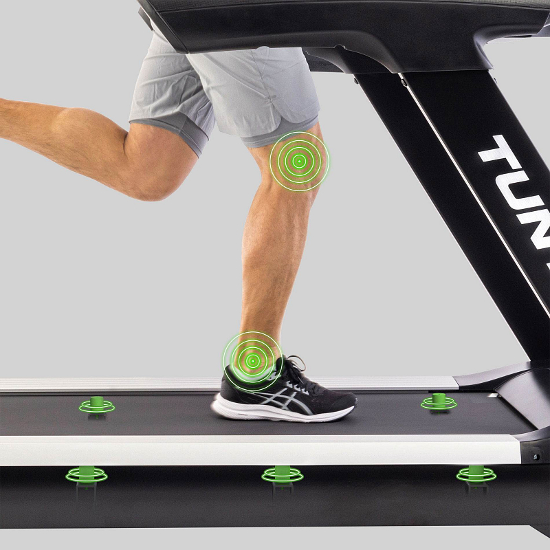 Běžecký pás Tunturi Platinum T20 má velkou běžeckou plochu 155 × 56 cm a systém tlumení nárazů pro bezpečný a pohodlný trénink. Díky tomu je běžecký pás vhodný i pro vyšší osoby. Běžecký pás má hrubý běhoun se šestidílným systémem tlumení. Ten zajišťuje dodatečné tlumení kolen a kloubů, což vám umožní trénovat déle a efektivněji s minimálním rizikem zranění.