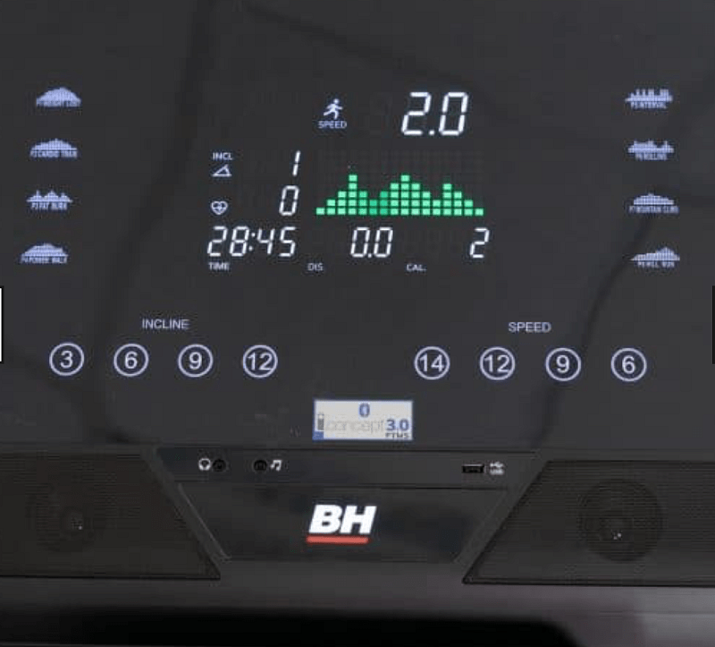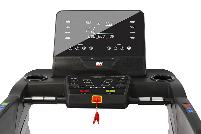 Ovládací konzole trenažeru BH Fitness RS900 je vybavena přehledným LED DOT Matrix displejem. Ovládání je velice jednoduché, kromě manuální regulace rychlosti a sklonu jsou součástí přednastavené zátěžové profily, které podle křivky regulují rychlost.