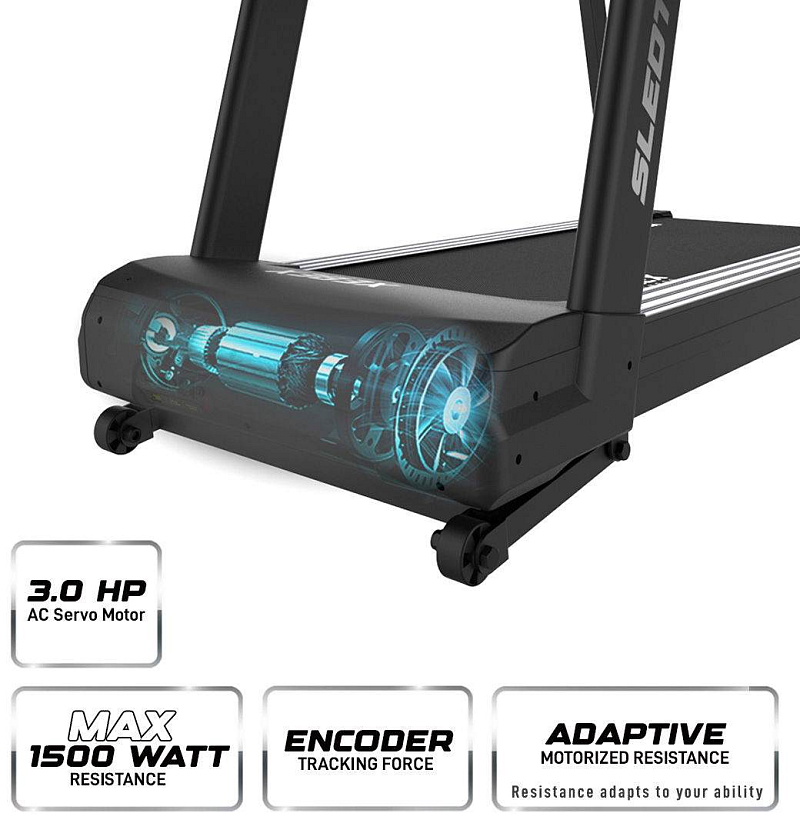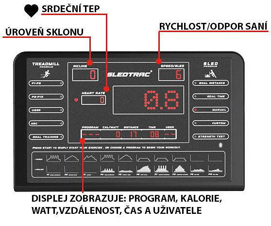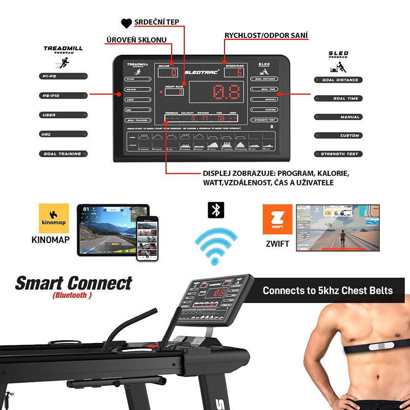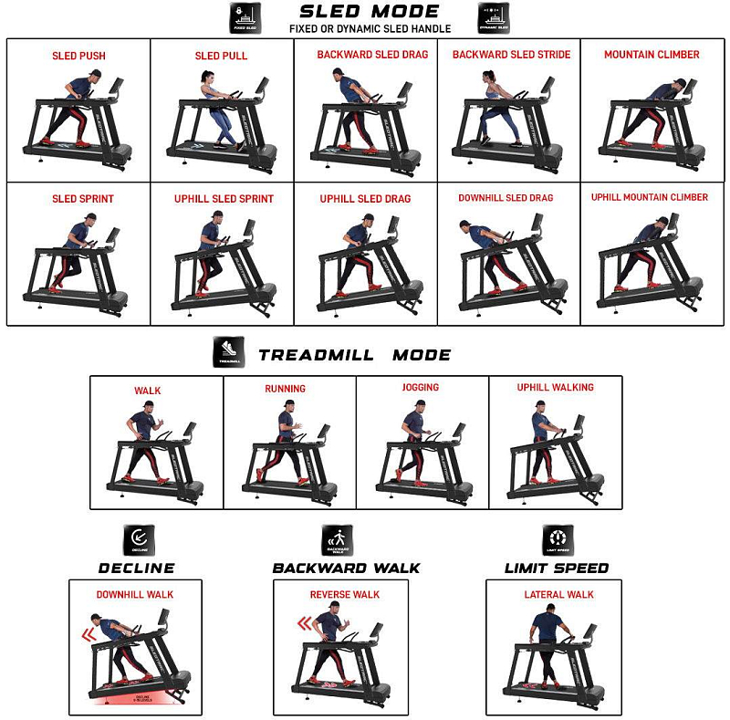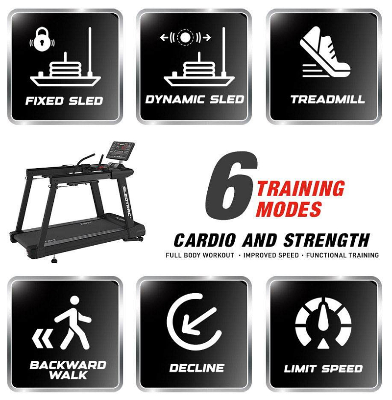 - DYNAMIC SLED MODE - Režim s až 10% sklonem, 15 nastavitelných úrovní sklonu, až 1500 WATT odpor, neomezená rychlost a pohyblivá madla díky bungee lanu. Tento režim je ideální pro spalování kalorií a realistický pocit z “tlačení saní“.