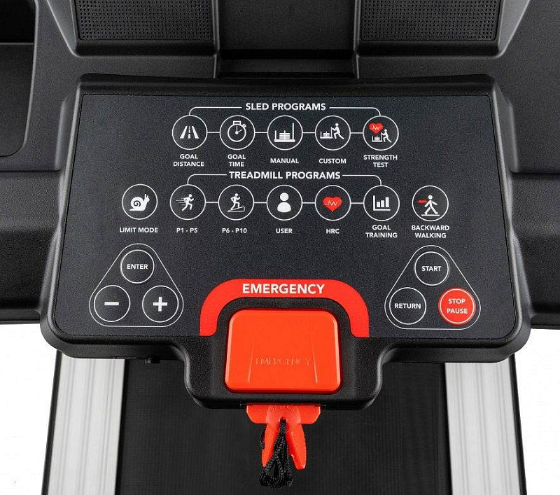 - FIXED SLED MODE - Režim s až 10% sklonem, 15 nastavitelných úrovní sklonu, až 1500 WATT odpor, neomezená rychlost a pevná (nepohyblivá) madla. Tento režim je ideální pro spalování kalorií a maximální soustředění na trénink.
