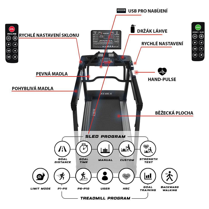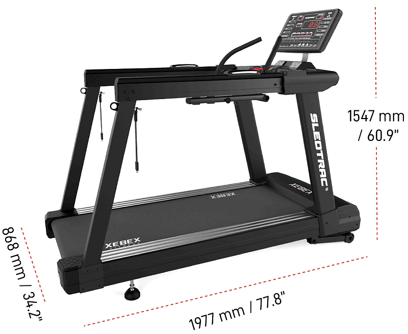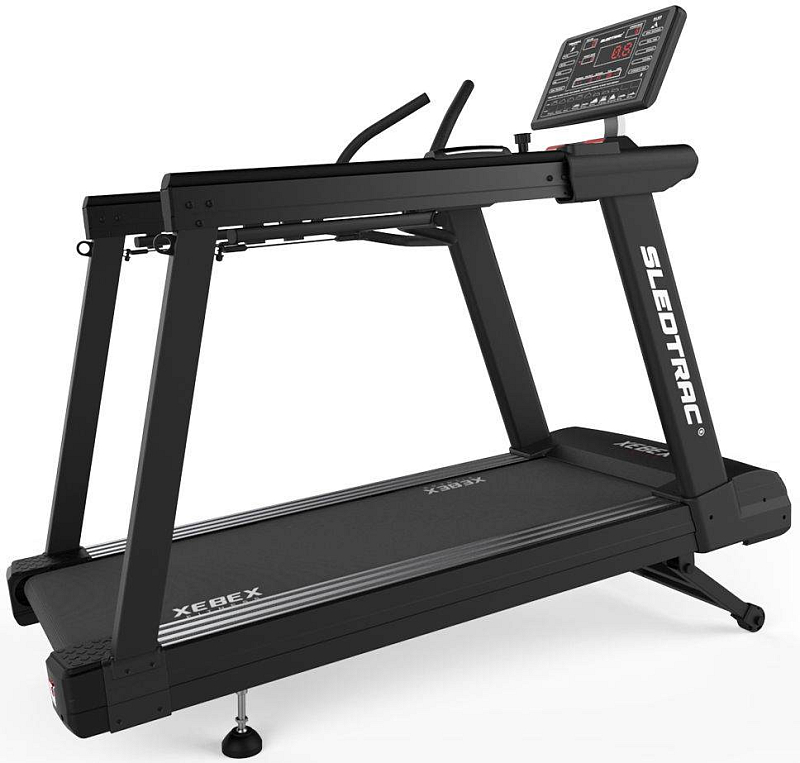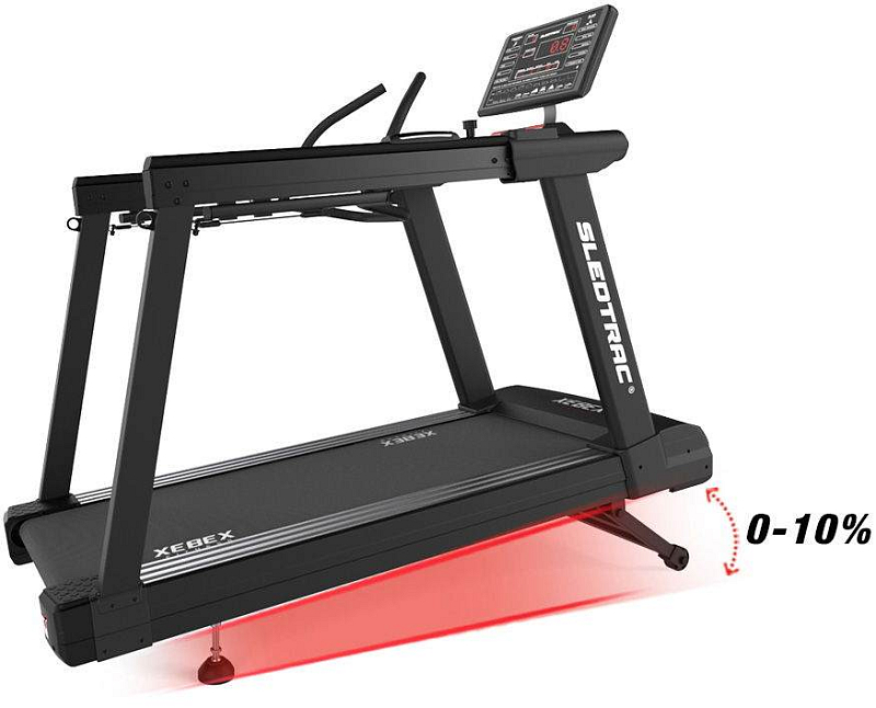 XEBEX SledTrac 6000 je profesionální běžecký pás pro ty nejnáročnější zákazníky, který je poháněn takřka nesmrtelným profesionálním AC motorem o síle 3 HP (koně) a odporu až neuvěřitelných 1500 Wattů. Předností XEBEX SledTrac 6000 je možnost běhu, chůze, tlačení saní, elektronického sklonu až do 10% úhlu, již zmíněný profesionální motor, masivní konstrukce a velmi prostorná běžecká plocha. Díky tomu můžete perfektně simulovat, chůzi, běh, tlačení saní na různé způsoby, chůze popředu i pozpátku a mnoho dalších. Madla saní mohou být díky elastickému bungee lanu pohyblivé, což perfektně simuluje tlačení saní a podtrhuje propracovanost tohoto trenažéru.