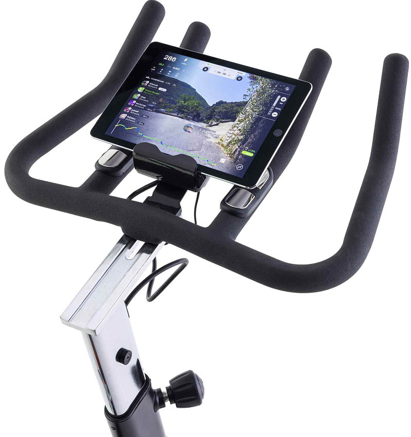 Jízda na cyklotrenažéru vás nudí? Sledujte během tréninku svůj oblíbený seriál nebo dobrý film. Monitor má na horní straně držák na tablet nebo chytrý telefon.