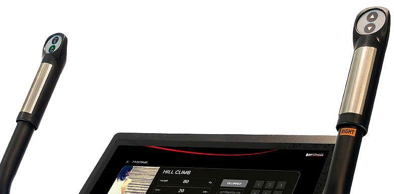 • Měření tepové frekvence: senzory na madlech, bezdrátově hrudním pásem s přesností EKG
