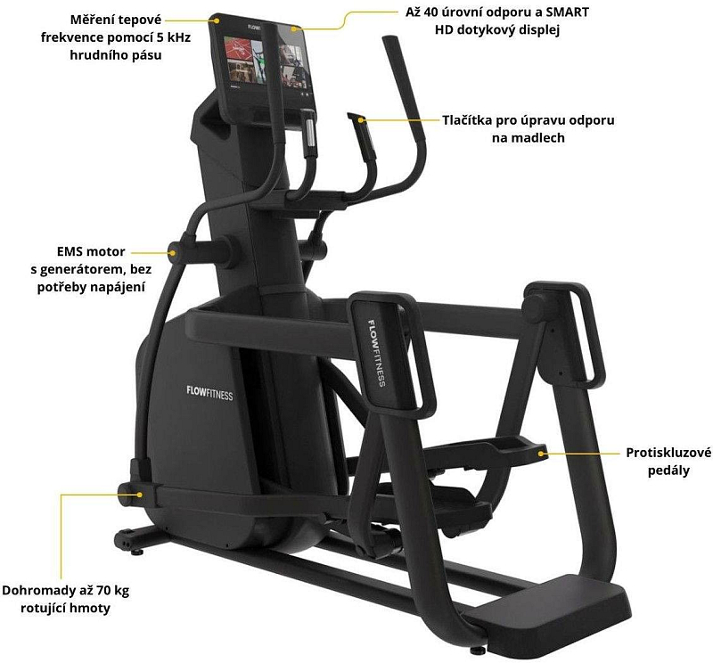 FLOW FITNESS X6i TFT je profesionální eliptický trenažér s grafickým HD dotykovým displejem. Ať už toužíte po aerobní relaci s nízkou intenzitou nebo intervalový trénink s vysokou intenzitou, tento prémiový eliptický stroj to zvládne všechno. Uspokojí každého začínajícího i profesionálního cvičence.