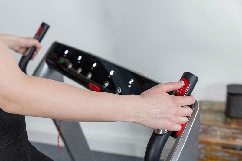 - Měření tepové frekvence: senzory na madlech, případně hrudním pásem Bluetooth přes tréninkové aplikace (hrudní pás není součástí dodávky, lze jej doobjednat).