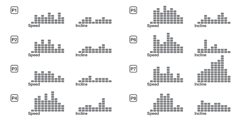 - Zobrazené hodnoty: čas, rychlost, vzdálenost, spálené kalorie, sklon, tep