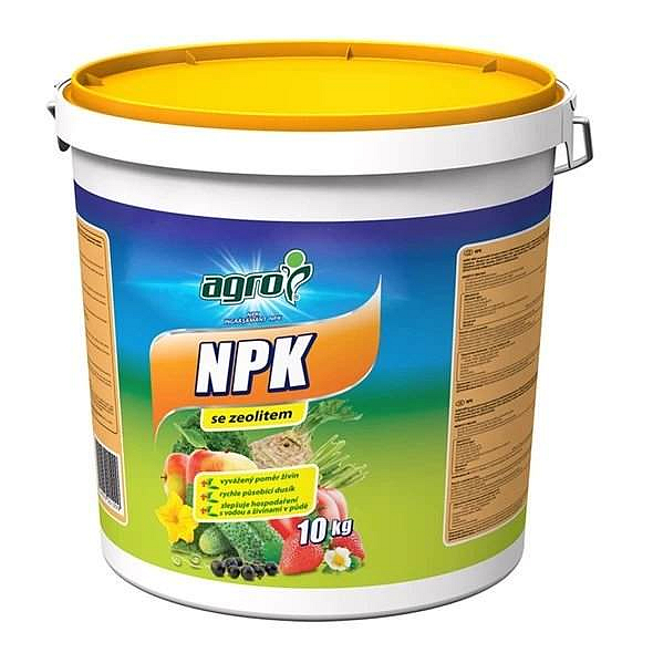 Agro NPK kbelík 10 kg je minerální hnojivo vhodné pro základní hnojení před setím či sázením rostlin na jaře i pro přihnojování během vegetace. Hnojivo má vyvážený poměr živin. Vysoký obsah dusíku v rychle působící formě způsobuje rychlejší a lepší start růstu rostlin. Obsahuje přírodní horninu ZEOLIT, který na sebe poutá živiny a následně je pozvolna uvolňuje do půdy pro potřeby rostlin. ZEOLIT rovněž vylepšuje strukturu a vzdušnost půdy. Hnojivo je vhodné pro rostliny citlivé na chlór a je celoročně použitelné.