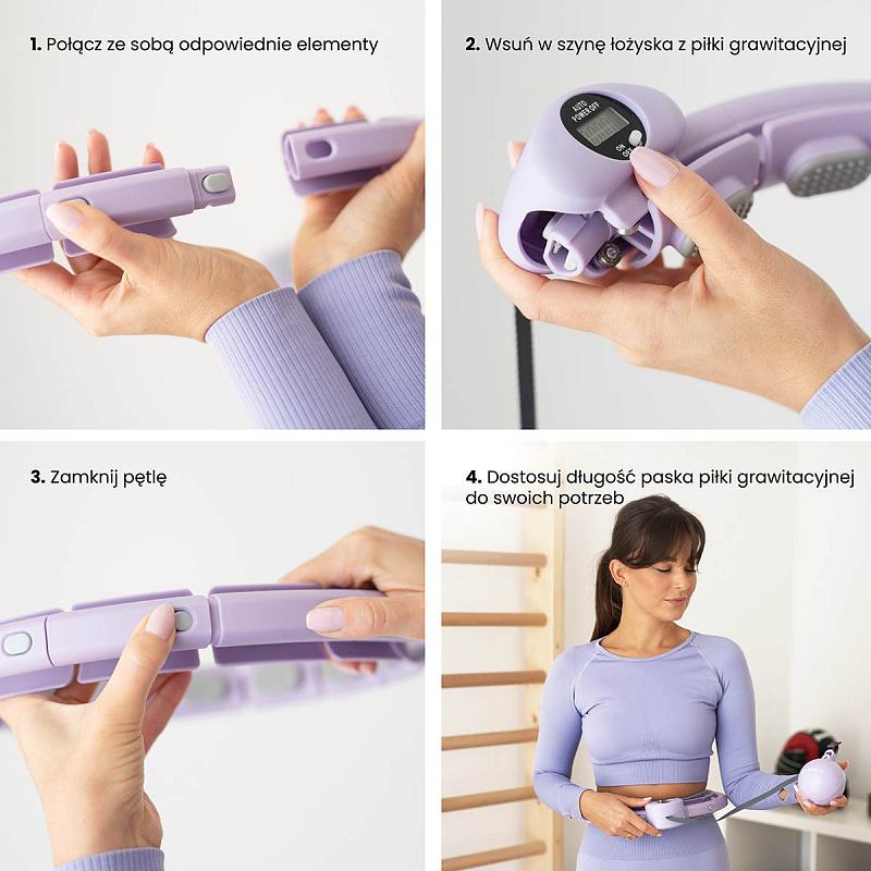 Délka obruče se nastaví podle obvodu pasu tak, aby byla dostatečně volná, ale zároveň aby nepadala přes boky. Po nastavení délky se obruč uzamkne pomocí spojovacího dílu, který je osazen páčkou pro ovládání zámku. Závaží se následně "vrhne" směrem, do kterého budeme kroutit boky a začneme trénink. Obruč HHW09 je z vnitřní strany opatřena masážními výstupky s pružinami, které tlumí vibrace od pohybující se kotvy a zároveň příjemně masírují oblast pasu. Intensitu tréninku ovlivňuje délka provázku a rychlost, jakou kroutíme boky.