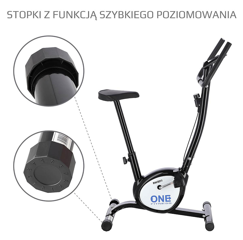 Mechanický volič umožňuje plynulé nastavení zátěže, pohodlné sedlo je výškově nastavitelné do 6-ti poloh, pedály jsou opatřeny řemínky a jejich délku lze nastavit pomocí suchého zipu. Tyto prvky jsou zárukou komfortního tréninku. Díky absenci zátěžového kola je rotoped lehký, má pouze 9,4 kilogramu, a lze ho snadno přenášet. Výškově nastavitelné koncovky na zadním stabilizátoru umožňují vyrovnání trenažéru do roviny. Vzhledem ke konstrukci je mechanický rotoped ONE Fitness RW3011 vhodný pro doplňkový trénink, nebo jako vedlejší pohybová aktivita, nosnost je 100 kg.