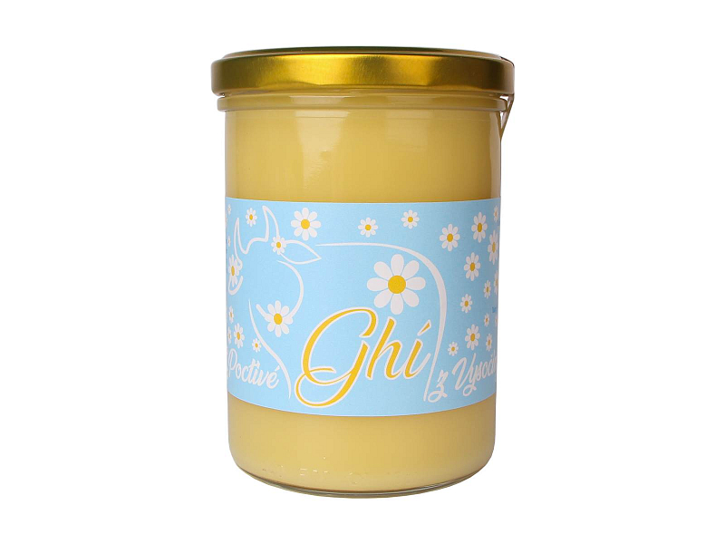 Poctivé Ghí z Vysočiny - přepuštěné máslo vysoké kvality pro smažení bez přepalování s obsahem několika vitamínů nebo minerálů. Složení: máselný tuk min. 99,3 % Upozornění: Může obsahovat stopy mléka. Země původu másla: Česká Republika Skladování: Skladujte v 5 - 20° C v šeru. Případná změna konzistence při vyšších teplotách není na závadu. Výživové údaje na 100 g Energetická hodnota 3700 kj / 883 kcal Tuky 99,9 g - z toho nasycené mastné kyseliny 67,4 g Sacharidy 0 g - z toho cukry 0 g Bílkoviny <0,1 g Sůl 0 g