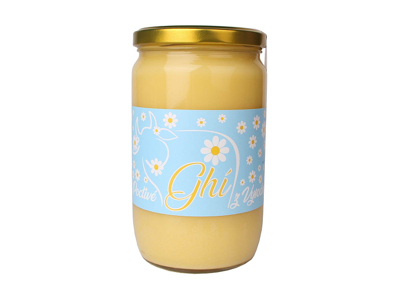 Poctivé Ghí z Vysočiny - přepuštěné máslo vysoké kvality pro smažení bez přepalování s obsahem několika vitamínů nebo minerálů. Složení: máselný tuk min. 99,3 % Upozornění: Může obsahovat stopy mléka. Země původu másla: Česká Republika Skladování: Skladujte v 5 - 20° C v šeru. Případná změna konzistence při vyšších teplotách není na závadu. Výživové údaje na 100 g Energetická hodnota 3700 kj / 883 kcal Tuky 99,9 g - z toho nasycené mastné kyseliny 67,4 g Sacharidy 0 g - z toho cukry 0 g Bílkoviny <0,1 g Sůl 0 g
