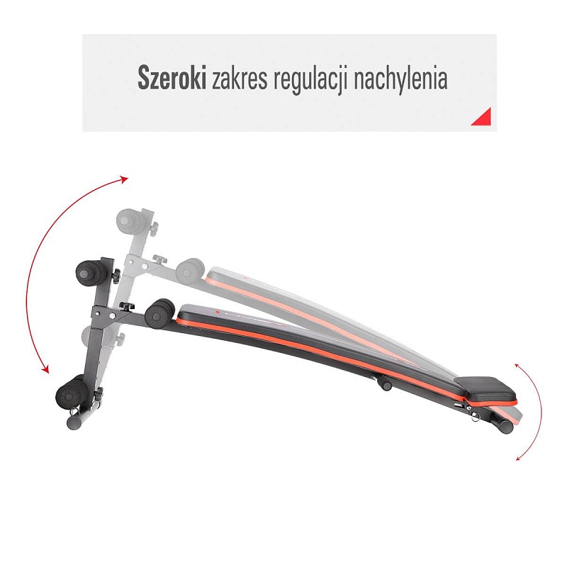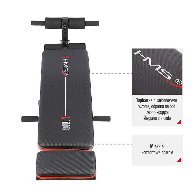Lavice HMS L1110 je nejen stabilní, ale také pohodlná. Měkká pěna na opěradle a pěnové válce zajišťují pohodlí po celou dobu tréninku. Čalounění s karbonovým vzorem je nejen stylové, ale také odolné proti potu a zabraňuje klouzání těla během cvičení. Nastavitelný sklon umožňuje snadno upravit obtížnost cvičení podle vašich potřeb. Čím vyšší je sklon, tím pokročilejší je cvičení.