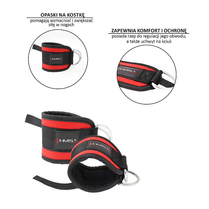 Popruh na kotník HMS je miniaturní cvičební pomůcka, vhodná k procvičení adduktorů, abduktorů, hamstringů a hýždí. Popruh se dá připevnit k posilovací věži a také k různým expandérům.