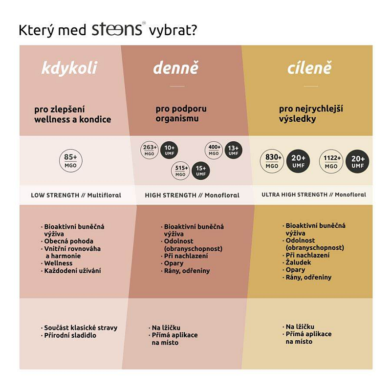 Steens Manuka Honey je raw nepasterizovaný pravý manukový med z Nového Zélandu. Pochází od včel opylujících Balmín metlatý, keř s bílorůžovými květy pocházející původně z Austrálie a Zélandu, kde mu původní domorodé maorské kmeny daly název Manuka. Med z květů Manuky má výjimečný výživový profil - obsahuje celé spektrum enzymů, aminokyselin, antioxidantů, vitamínů, minerálů a dalších látek s velmi zajímavými vlastnostmi. Manukový med je také známý jako chuťově výraznější, bohatší a plnější než jiné medy. Je to dáno velmi vysokou koncentrací účinných látek.