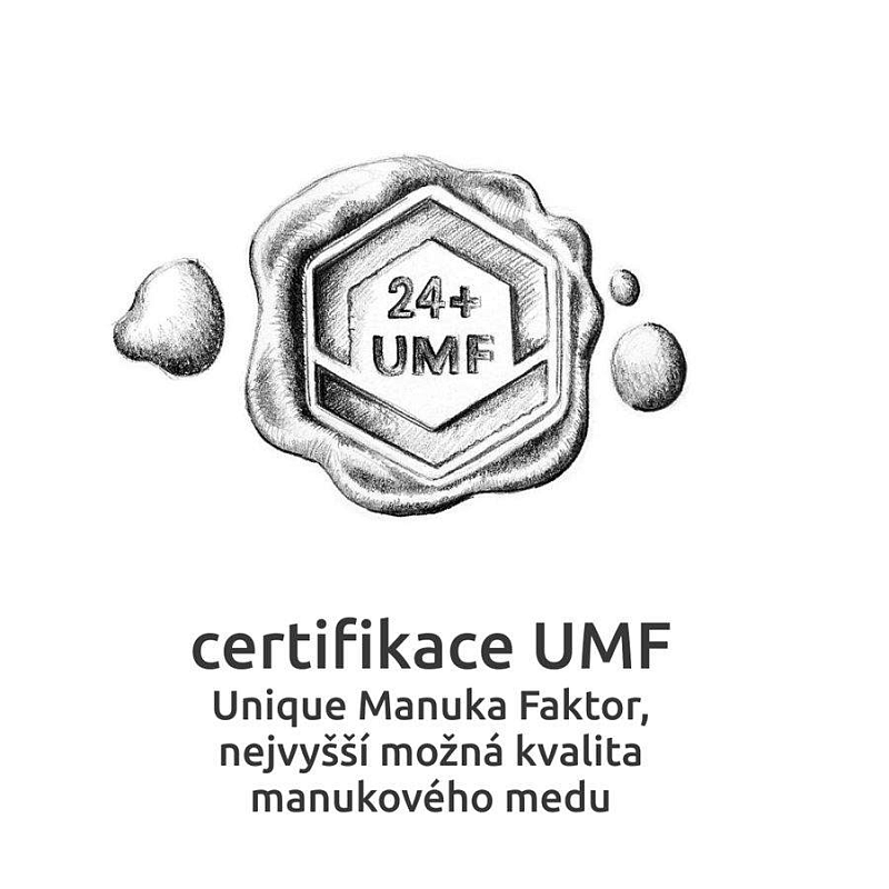 UMF (Unique Manuka Factor) = komplexní certifikát posuzující Manuku zahrnující kromě MGO charakteristiky také obsah leptosperinu (lze podle něj určit zda je med pouze z novozélandské Manuky), obsah dihydroxyacetonu, který se přeměňuje na methylglyoxal (je jeho prekurzorem) a obsah hydroxymethylfurfuralu, který prokáže, že med nebyl příliš zahříván. Souhrn všech těchto čtyř charakteristik je dosažitelný pouze u monofloral Manuky, tzn. Manukového medu pocházejícího pouze a jenom z Manuky, ne z jiných rostlin. Jde o nejvyšší kategorii medu s nejsilnějšími vlastnostmi a nejvyšším obsahem účinných látek.