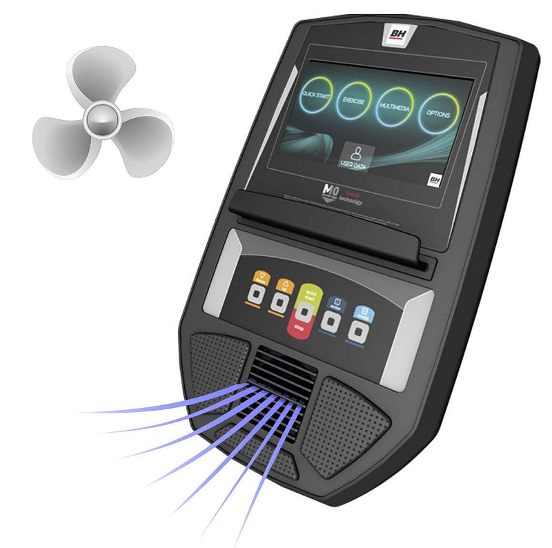Součástí rotopedu BH Fitness Carbon Bike TFT je dotykový počítač s držákem na tablet/smartphone, senzory pro měření tepové frekvence, vyrovnávače nerovnosti, transportní kolečka a držák na lahev.