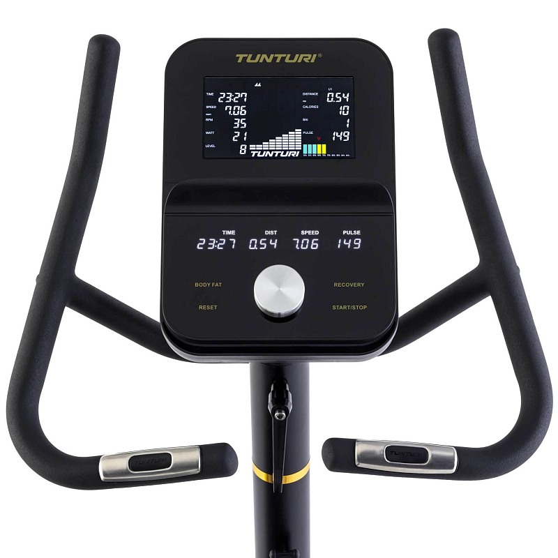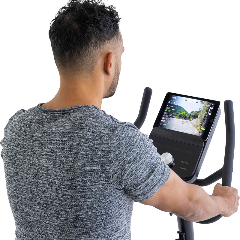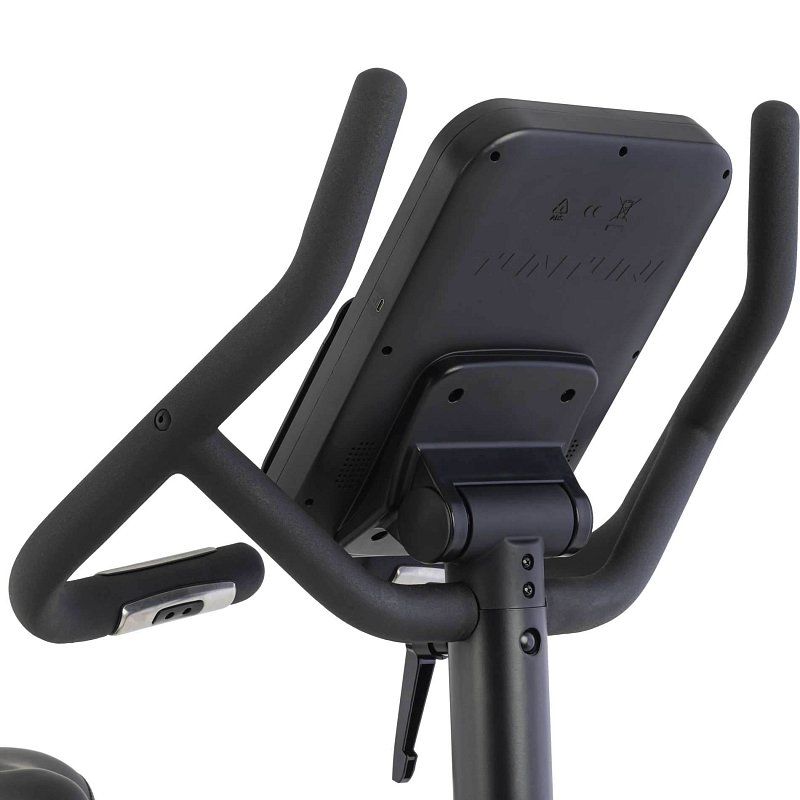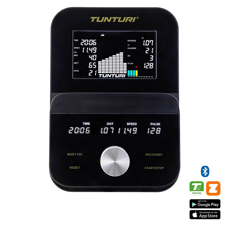 Jasná obrazovka je nakloněná pro optimální viditelnost i při silném odrazu a integrovaný modul Bluetooth umožňuje připojit trenažér přímo k aplikacím, jako jsou Tunturi Routes, Kinomap a Zwift.