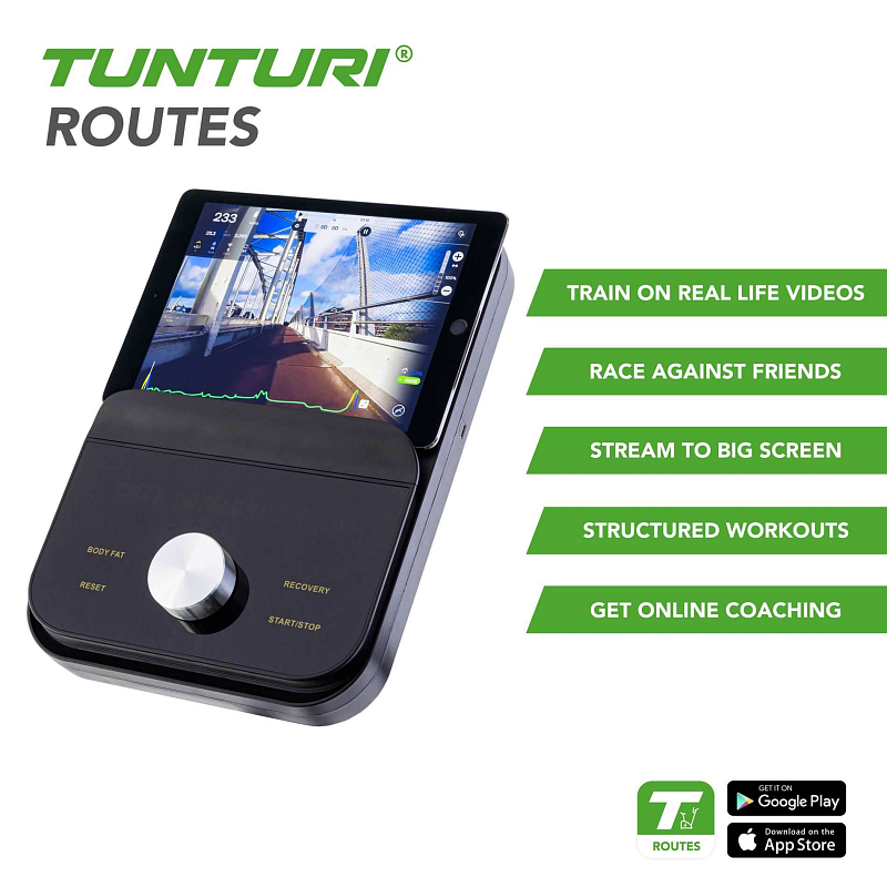 Stoupáte na Alpe d'Huez na kole? Svištíte na lyžích po sněhu v Alpách? S aplikací Tunturi Routes zůstává trénink zábavou a výzvou. Bezplatná verze aplikace poskytuje vždy přístup k patnácti videotrasám. S prémiovou verzí Tunturi Routes si můžete vybrat ze stovek tisíc kilometrů tras po celém světě a stovek tréninkových videí. Váš trénink bude skutečným vizuálním zážitkem!