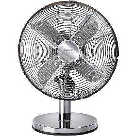 Kovový stolní ventilátor Průměr lopatek 25 cm Vysoce kvalitní pochromované provedení Přední a zadní kovová ochranná mřížka 3 rychlosti Automatická horizontální rotace v úhlu 90° s možností vypnutí Nastavitelný úhel sklonu Ochrana proti přehřátí Otočný spínač na krytu motoru Pogumovaná spodní část ventilátoru zajišťující vysokou stabilitu Příkon: 30 W