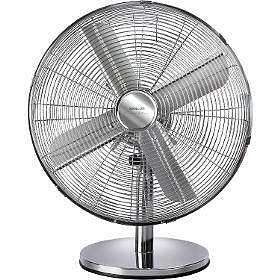 Kovový stolní ventilátor Průměr lopatek 40 cm Vysoce kvalitní pochromované provedení Unikátní design lopatek pro tichý chod a maximální výkon Přední a zadní kovová ochranná mřížka 3 rychlosti Automatická horizontální rotace v úhlu 90° s možností vypnutí Nastavitelný úhel sklonu Ochrana proti přehřátí Otočný spínač na krytu motoru Pogumovaná spodní část ventilátoru zajišťující vysokou stabilitu Příkon: 50 W