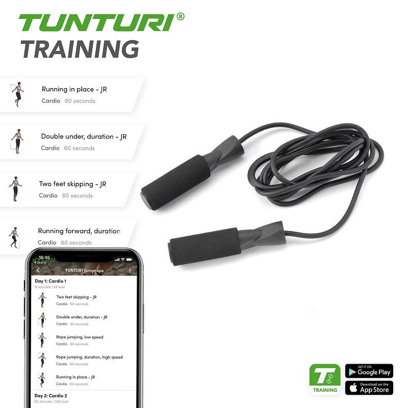Skákejte si k silnému a pružnému tělu s tímto švihadlem Tunturi Jumprope Tube s gumovými rukojeťmi a kuličkovými ložisky!