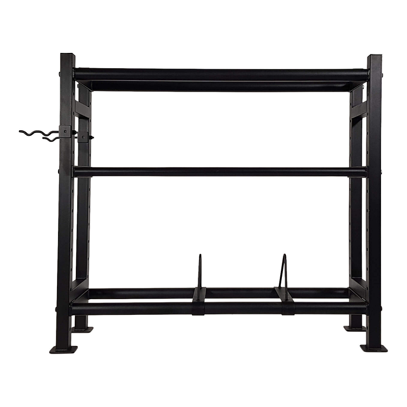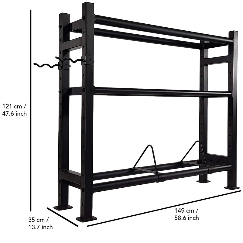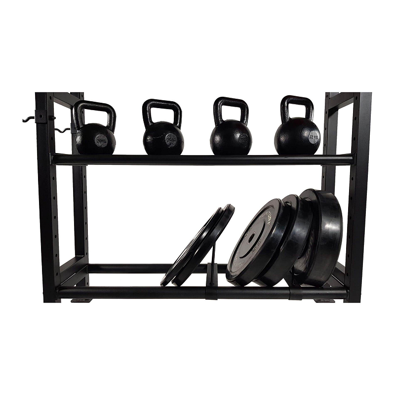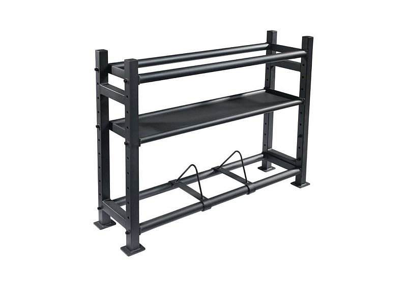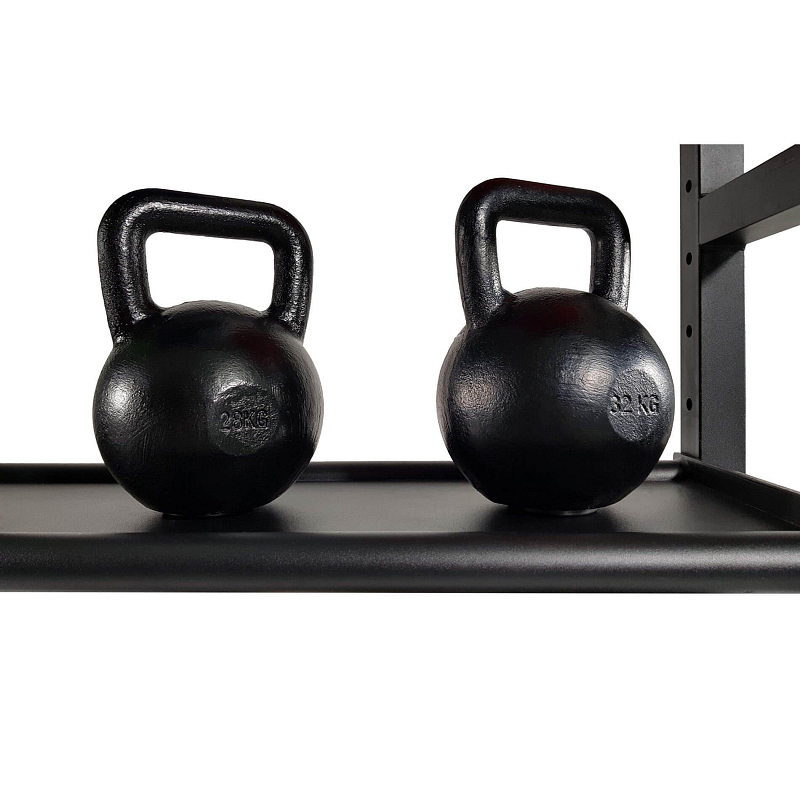 - Pevný stojan pro bezpečné uložení kettlebellů, nástěnných míčů a zátěžových desek.