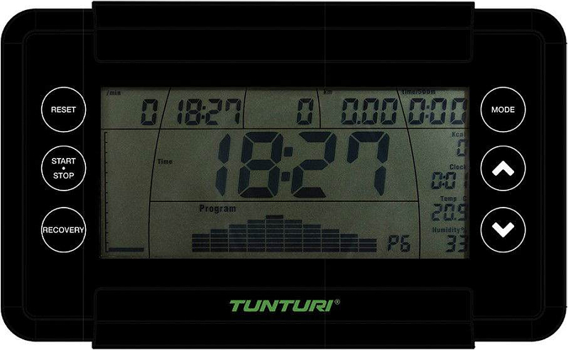 Jednoduše ovladatelný a nastavitelný počítač je napájen tužkovými bateriemi, takže nejste omezeni připojením v místnosti. Přehledný LCD displej s 6 zobrazovanými funkcemi měří čas, tréninkovou vzdálenost, puls, frekvenci záběrů, celkový počet záběrů a spotřebu energie. Vyhodnocení vydýchávacího pulsu včetně stanovení kondiční známky 1-6.
